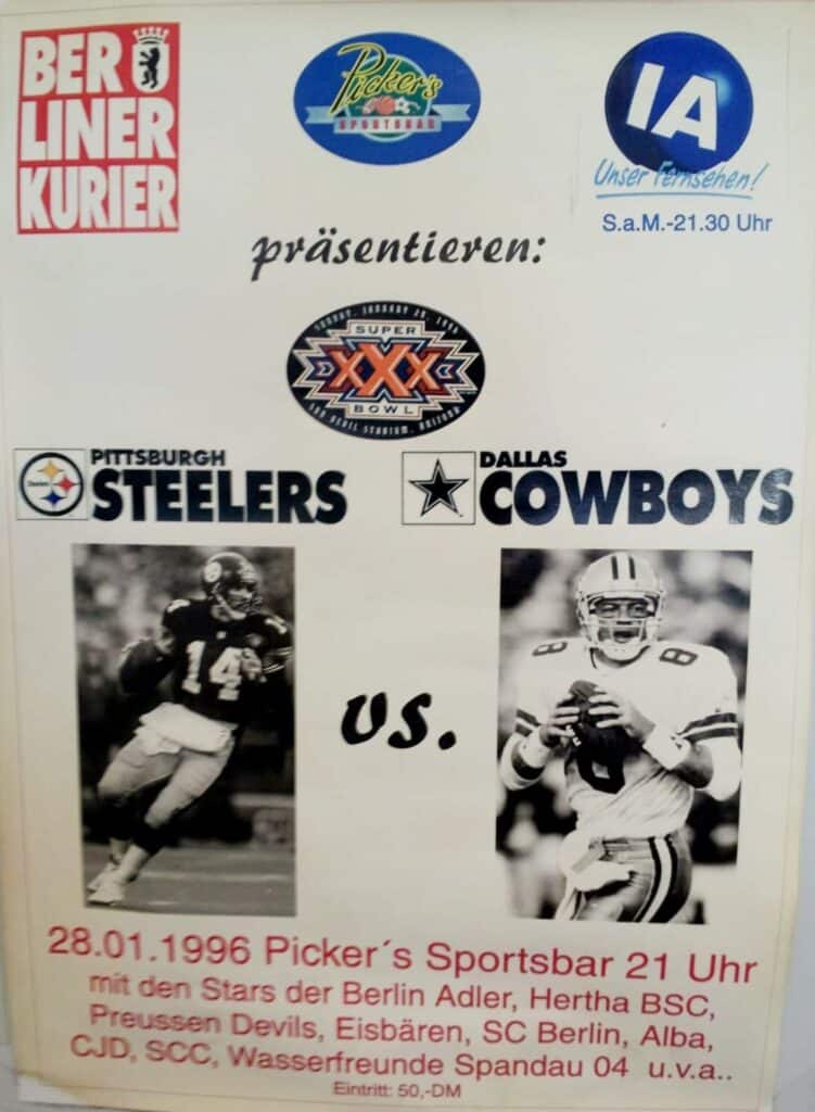 Von meinem Arbeitgeber Berliner Kurier gesponsert. Stefan Mücke, Ex-Adler, war der Gastgeber in seiner frisch eröffneten Sportsbar. Zusammen hatten wir beschlossen, Superbowl-Partys in Berlin zu starten – ein Ort, an dem Football lebendig wurde.